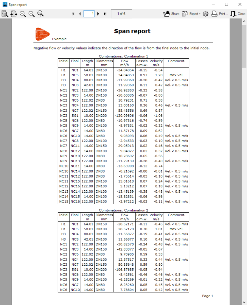 Permite imprimir el listado de resultados en los tramos. Incluye la siguiente información, que se puede activar o desactivar:- Nudo inicial y final (opcional)