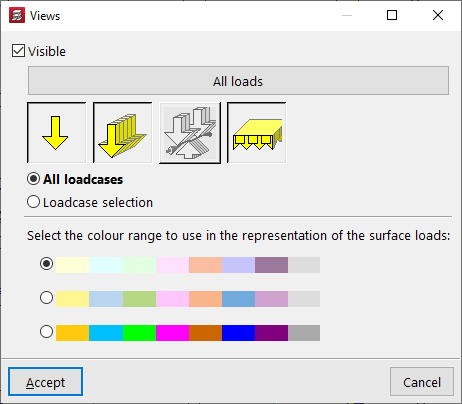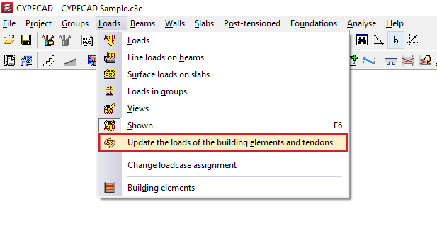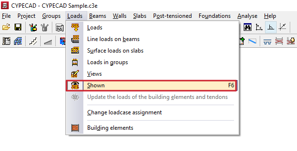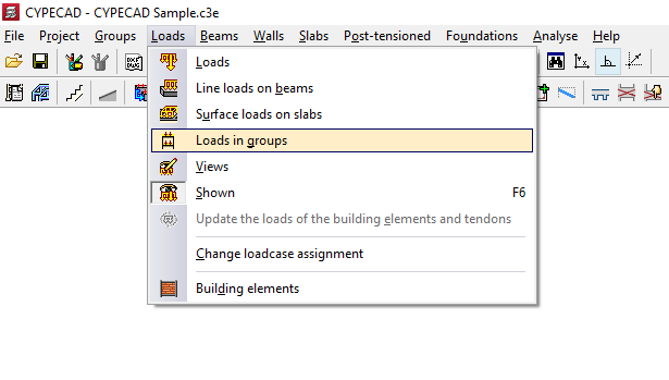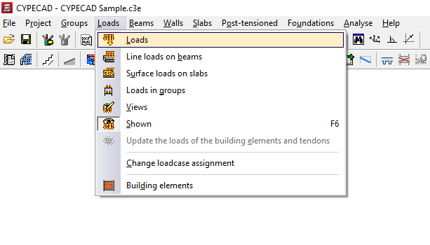 - las opciones para introducir y editar cargas de diferentes tipos (cargas puntuales, cargas lineales en vigas, cargas superficiales en paños y cargas en grupos), para gestionar su visualización, para actualizar las cargas de los elementos constructivos y de los tendones de losas postesadas, y para cambiar su asignación de hipótesis;