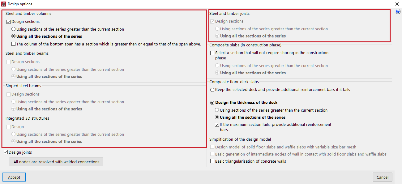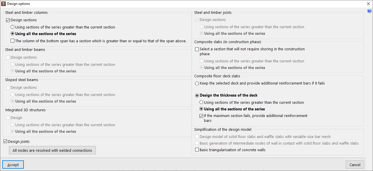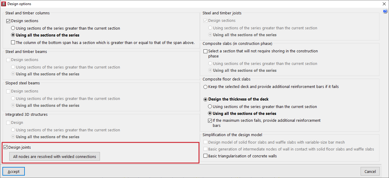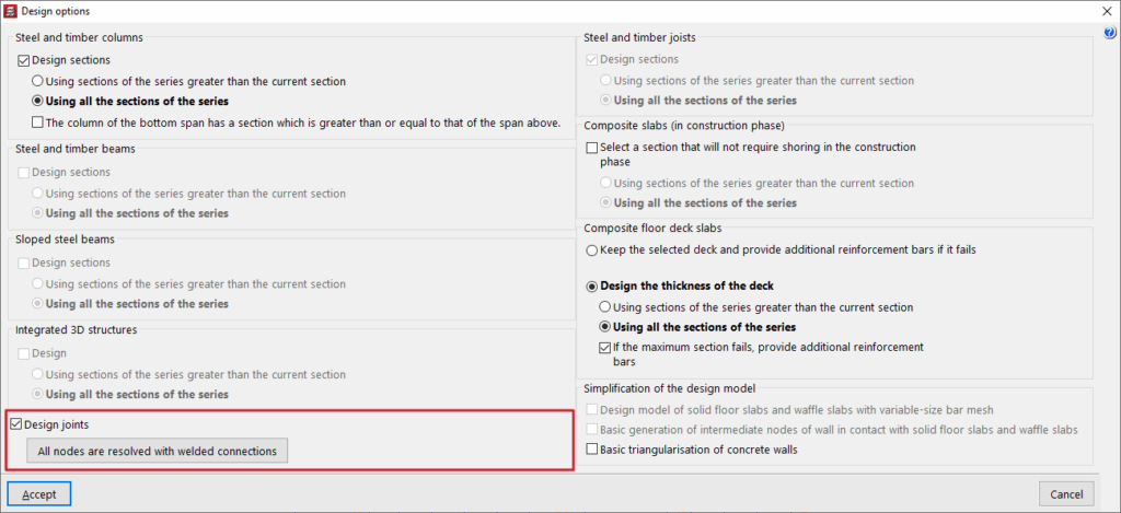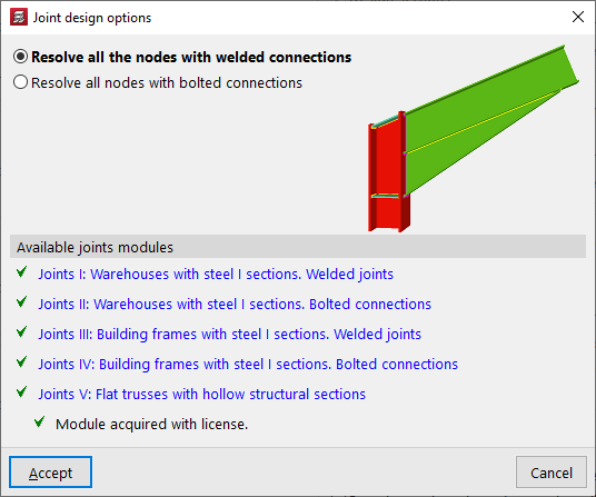 Es posible activar la casilla "Dimensionar las uniones" y, en la ventana emergente de "Opciones de dimensionamiento de uniones", decidir si se desea "Resolver todos los nudos con uniones soldadas" o "Resolver todos los nudos con uniones atornilladas" en el mismo proceso de cálculo, si están disponibles en los módulos de uniones del programa.
