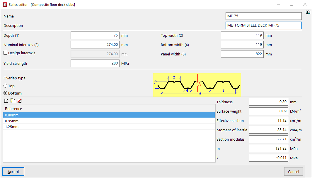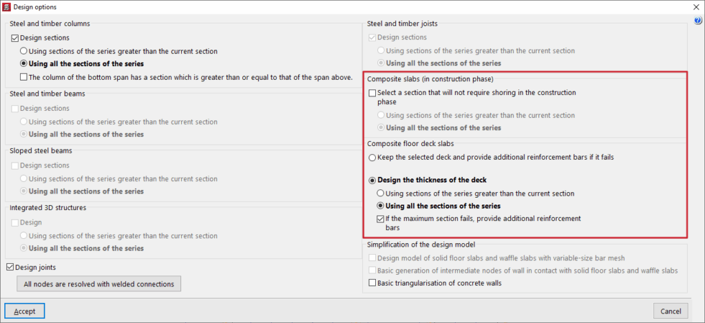 En el caso de obras con "Losas mixtas con chapa colaborante", se puede "Mantener la chapa colocada y colocar barras de refuerzo de positivos si ésta no cumple", o "Dimensionar el espesor de la chapa". El programa puede, "Si el perfil máximo no cumple, colocar barras de refuerzo de positivos" activando la última opción. Si se desactiva, se mostrará un incumplimiento en este caso.