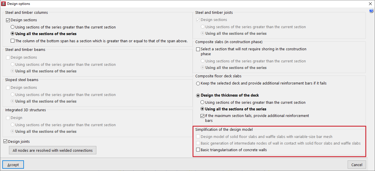 Al pulsar sobre esta opción, aparece la ventana "Opciones de dimensionamiento" únicamente con las opciones de "Simplificación del modelo de cálculo".