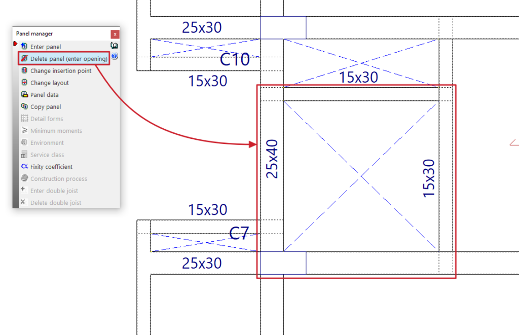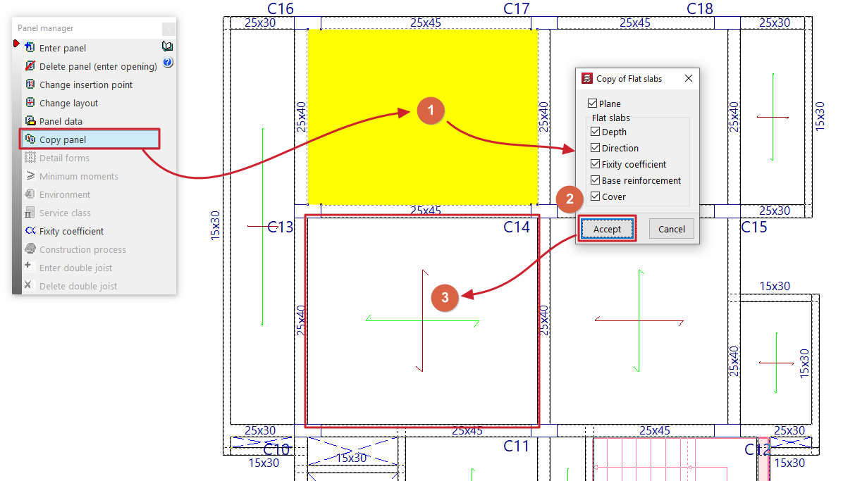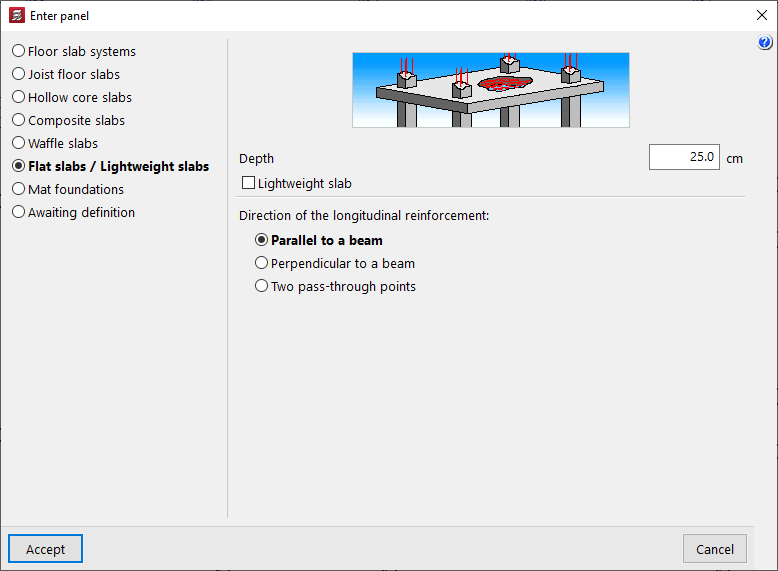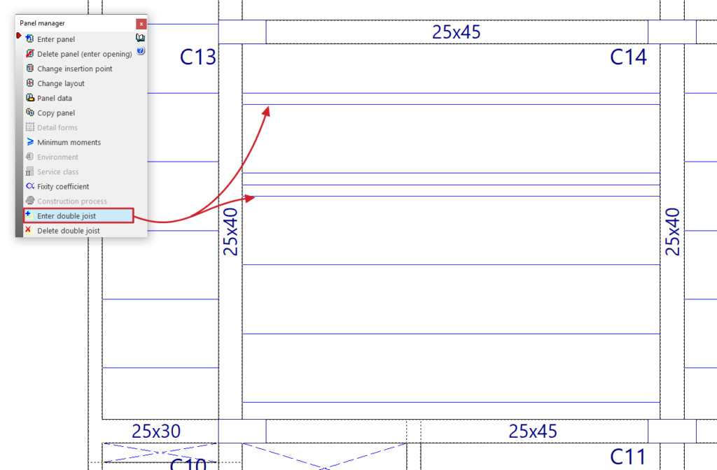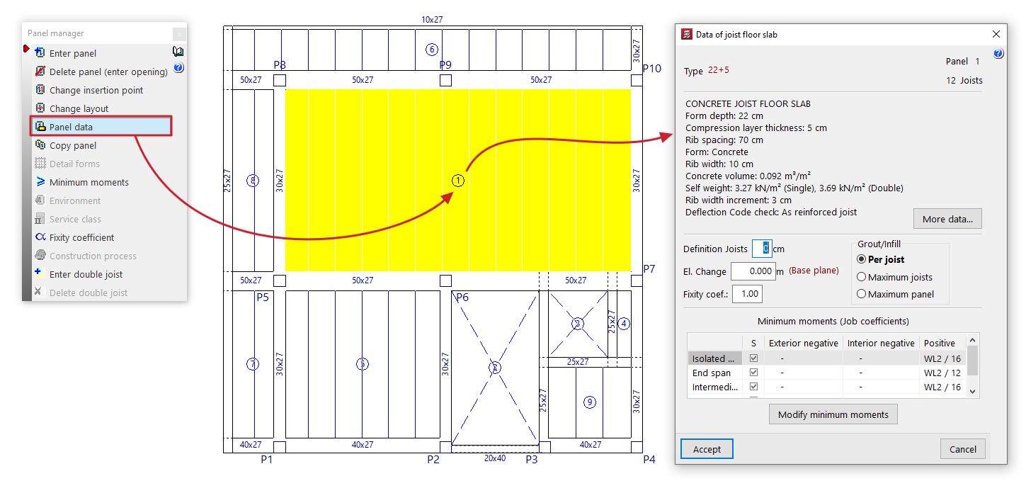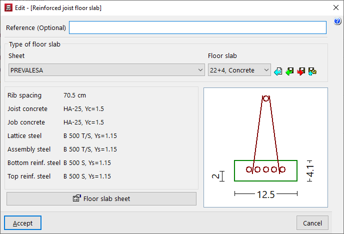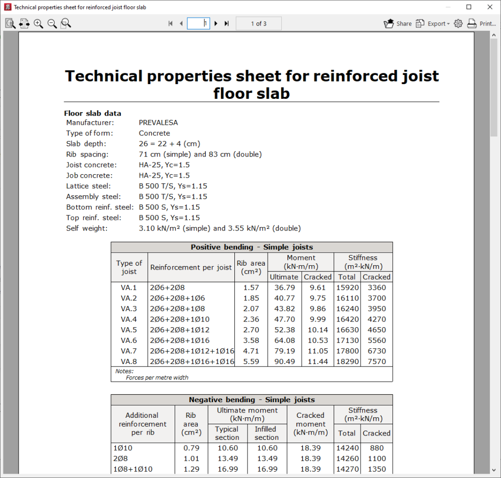 - la introducción y edición de paños de forjados, entre los que se encuentran los forjados de viguetas, placas aligeradas, losas mixtas, forjados reticulares, losas macizas, losas aligeradas y losas apoyadas en el terreno;