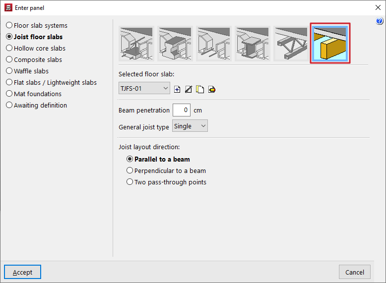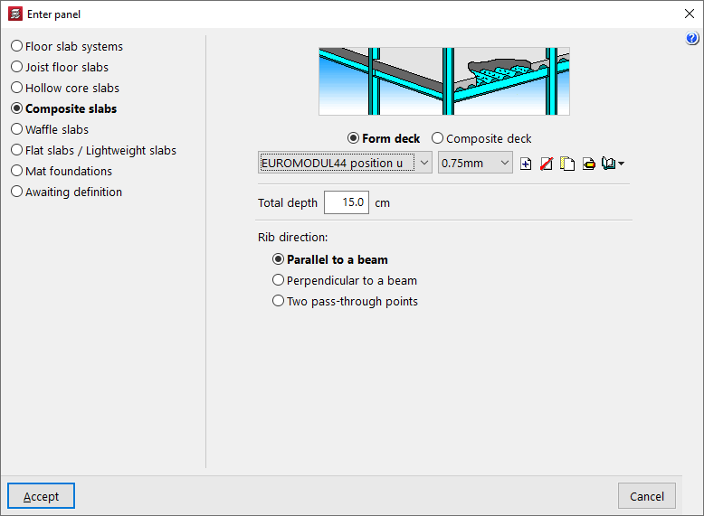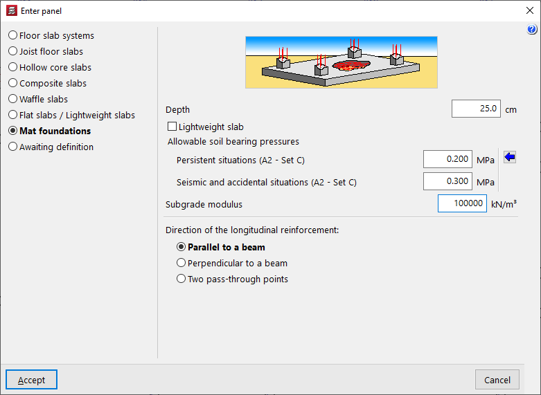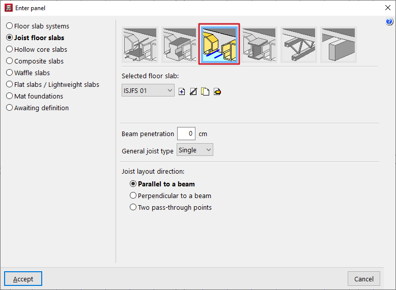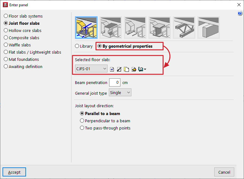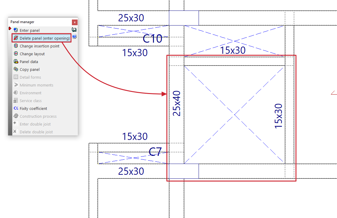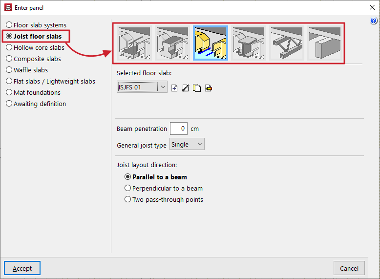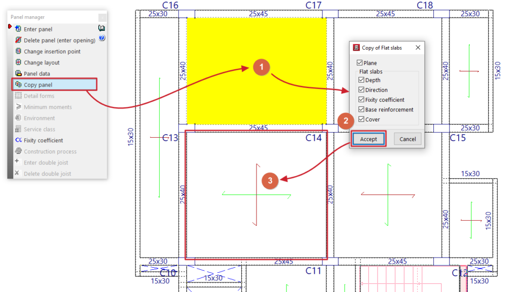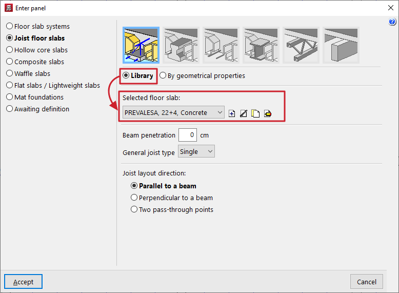 - la introducción y edición de paños de forjados, entre los que se encuentran los forjados de viguetas, placas aligeradas, losas mixtas, forjados reticulares, losas macizas, losas aligeradas y losas apoyadas en el terreno;
