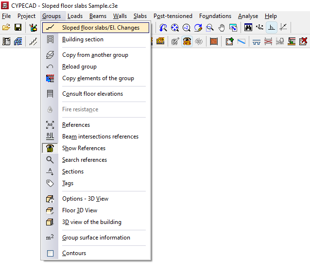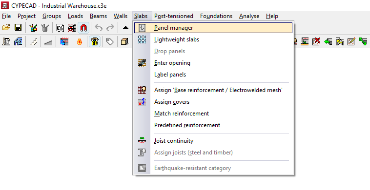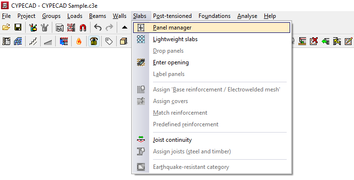 - en el menú "Postesados", las opciones de definición de losas postesadas, incluyendo la configuración de su trazado y carga de tesado, la introducción de tendones y de líneas de flexión de tendones, y de edición y asignación de anclajes;