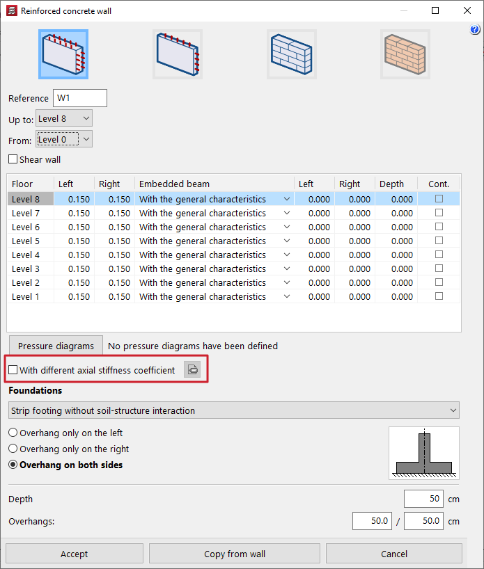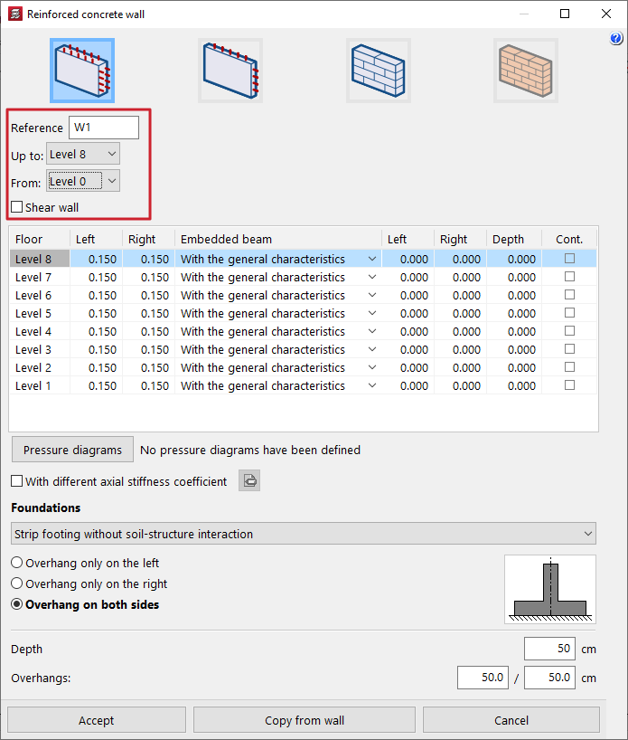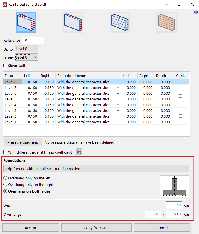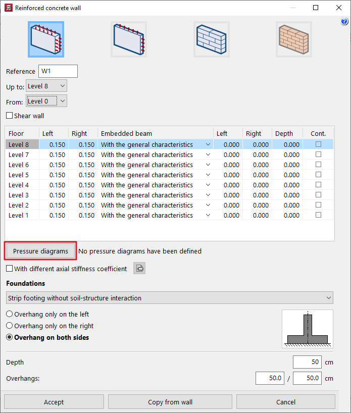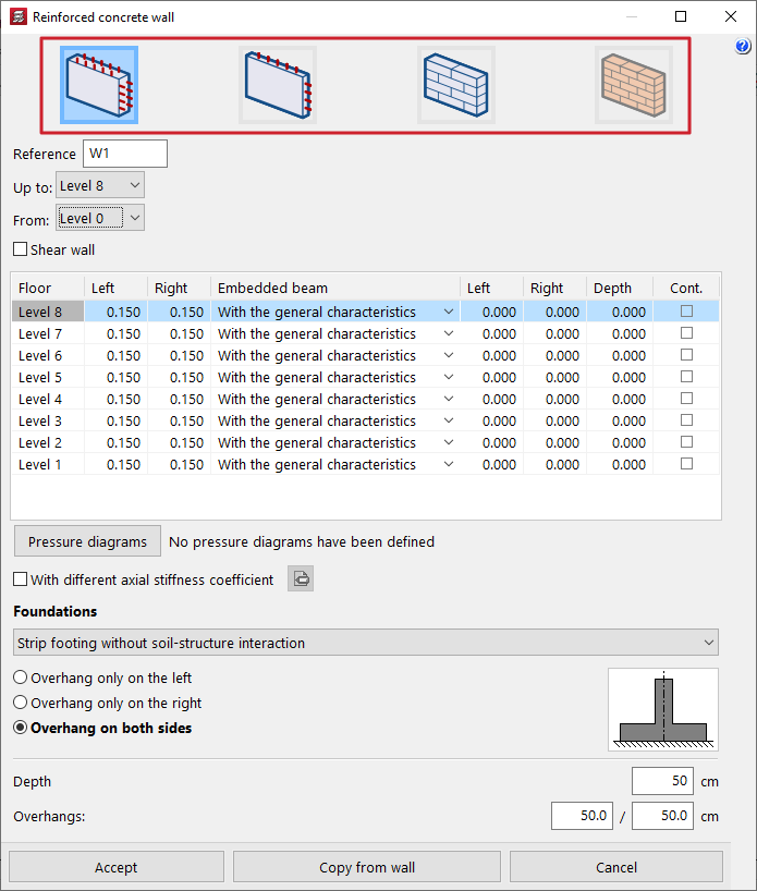 - la introducción y edición de muros de hormigón armado, muros de tensión plana, muros de fábrica y muros de bloque de hormigón;