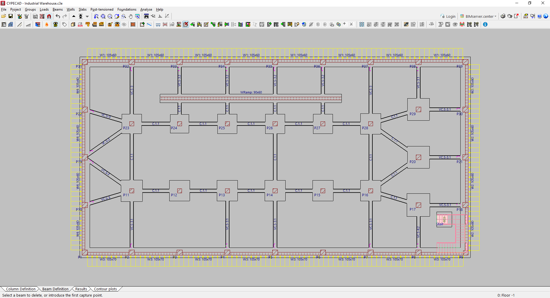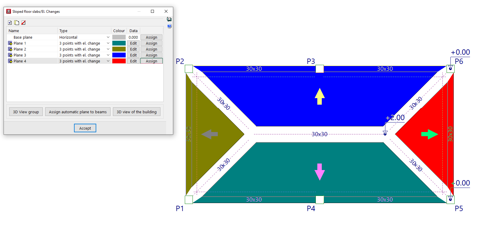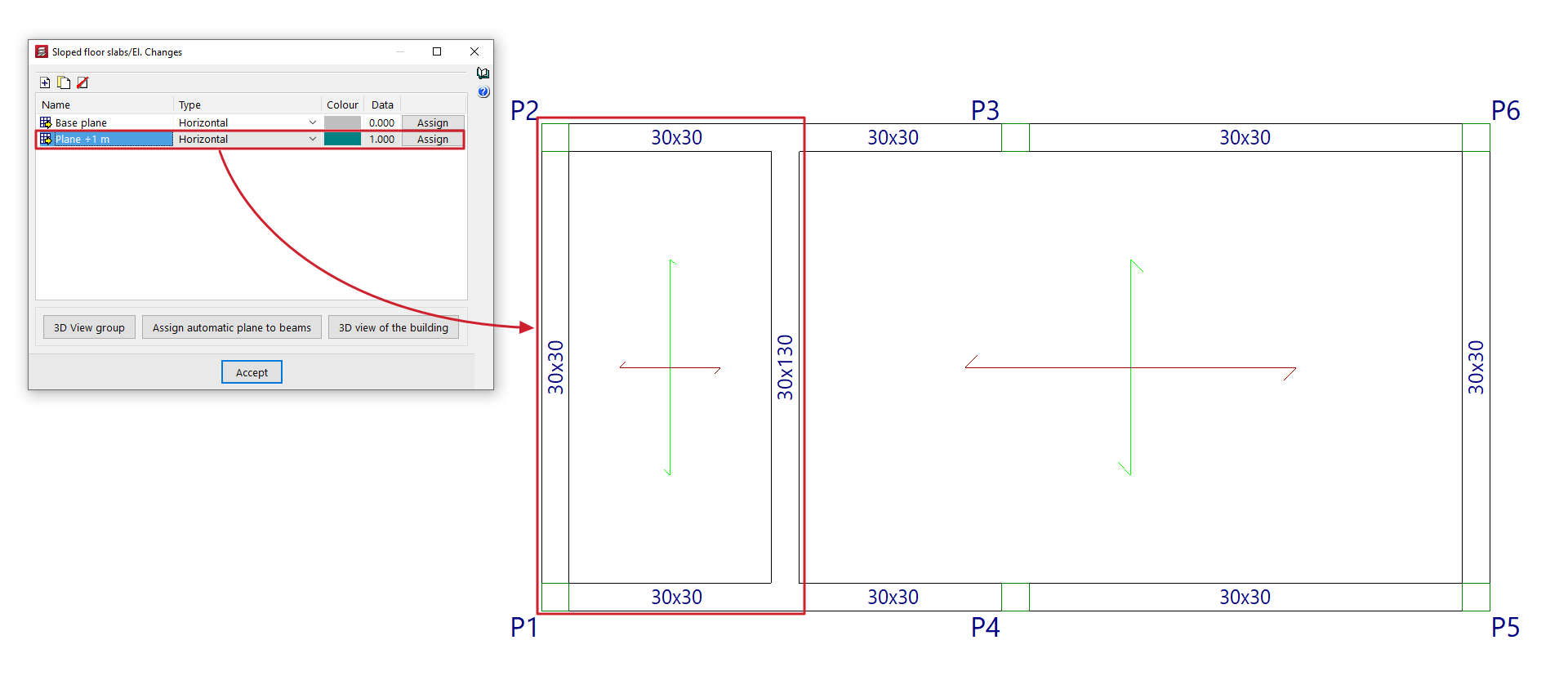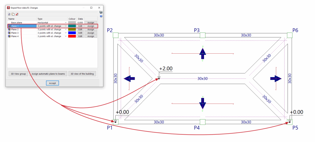 - las introducción de vigas (de punto a punto o mediante un borde exterior rectangular) y vigas inclinadas, y la definición de vigas comunes entre grupos de plantas;