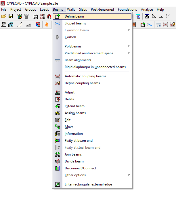 - y las opciones para editar y modificar la geometría de las vigas, obtener información de las mismas, definir empotramiento en sus extremos, unir y dividir vigas, y desconectar y conectar muros a pilares, así como la edición del resto de parámetros asociados a las vigas;