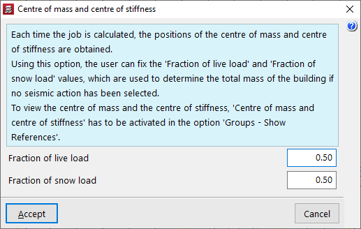 La opción "Centro de masas y centro de rigidez" permite fijar los valores de "Fracción de sobrecarga de uso" y "Fracción de sobrecarga de nieve", utilizados para determinar la masa total del edificio en el caso de no haber seleccionado ninguna acción sísmica.