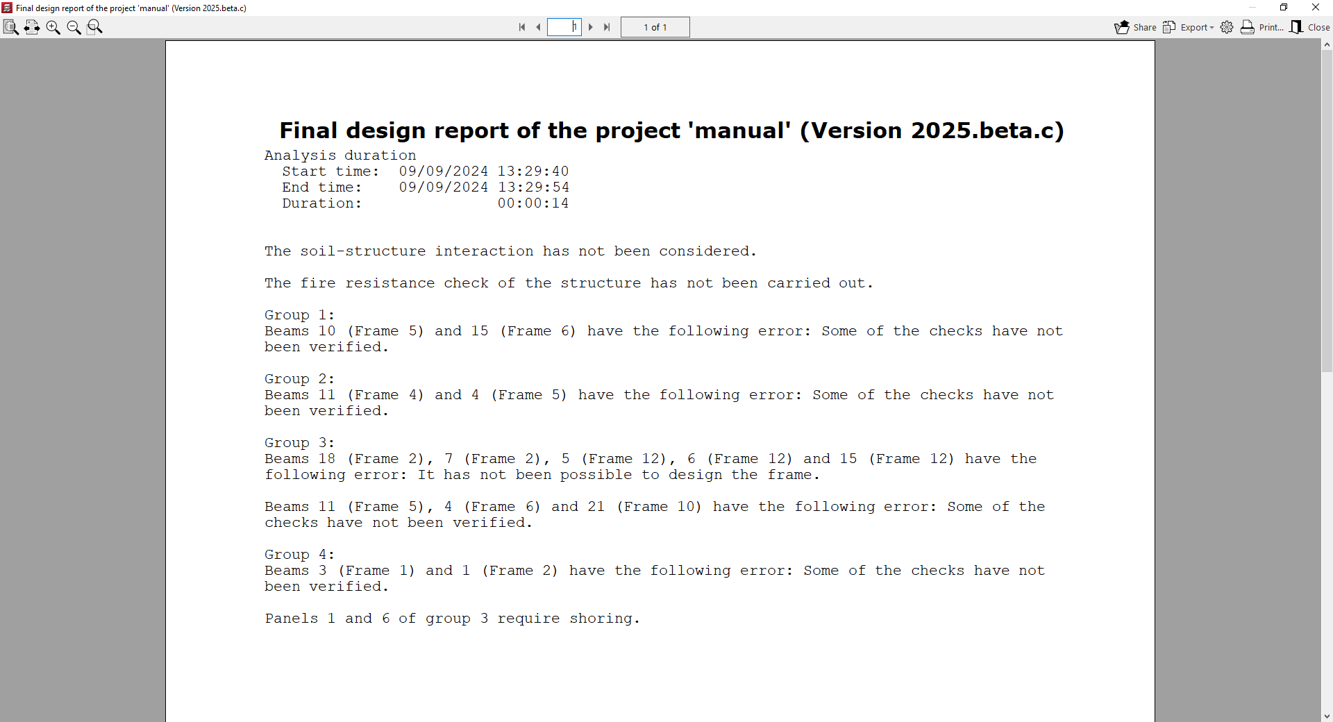 Tras utilizar una de estas opciones el programa lanza el proceso de comprobación de la geometría de los grupos indicados. Al terminar el mismo, se muestra el "Informe final de cálculo de la obra" si procede.