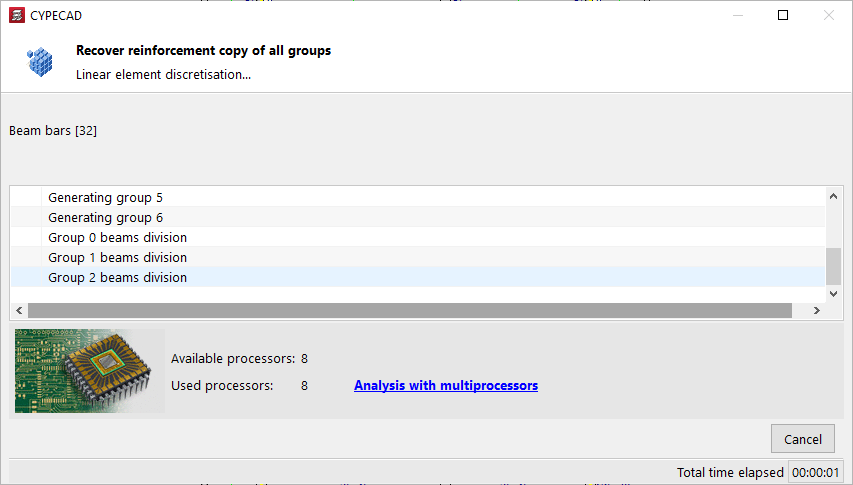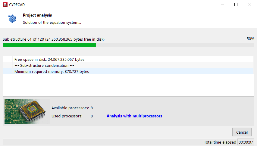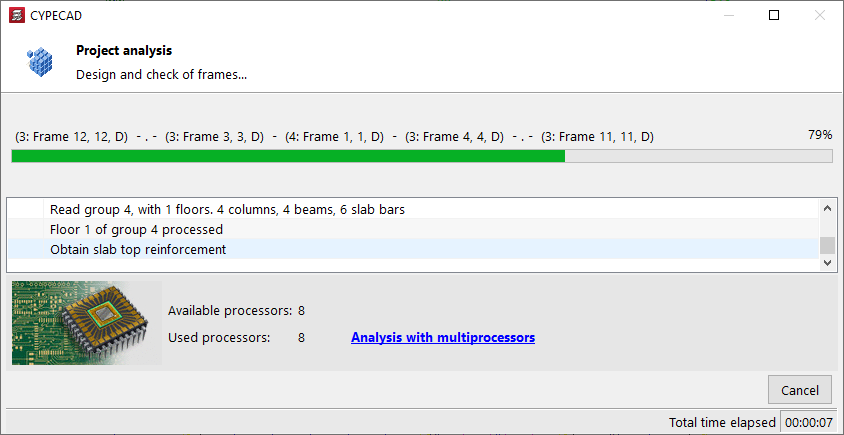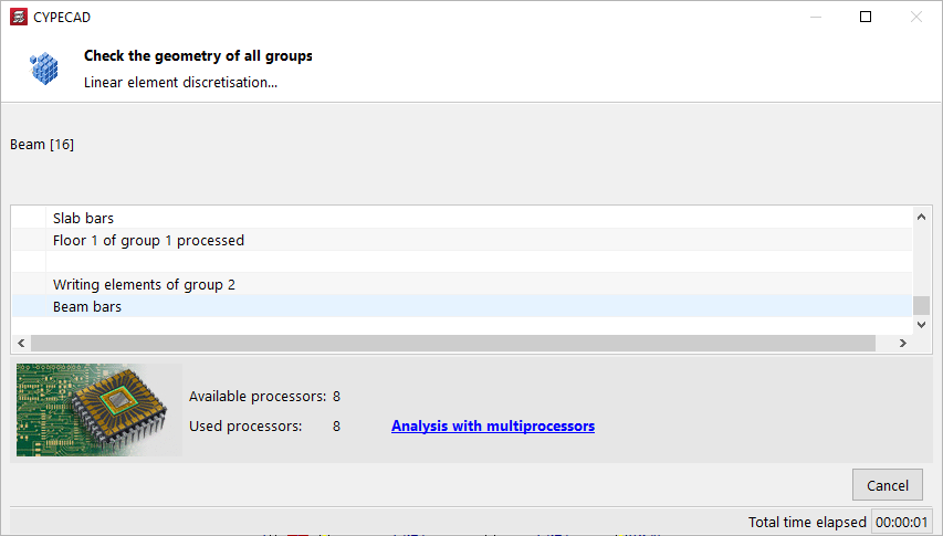 En la parte inferior, se muestra también el número de "Procesadores disponibles" y "Procesadores utilizados" además del "Tiempo total transcurrido" desde el comienzo del cálculo. En algunas fases del cálculo, el programa es capaz de utilizar un número mayor de procesadores si se dispone del cálculo con multiprocesadores.
