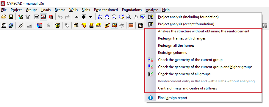 - y en el menú "Calcular", las herramientas para realizar el cálculo de la obra, incluyendo o no la cimentación o sin obtener el armado, así como opciones para rearmar pórticos y/o pilares, comprobar la geometría de los grupos, introducir armados en losas y forjados reticulares u obtener el centro de masas y el centro de rigidez.