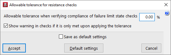 Esta opción permite abrir un cuadro de diálogo donde se define la "Tolerancia permitida al verificar el cumplimiento de las comprobaciones de estado límite de agotamiento". Para ello, se introduce un valor de porcentaje.
