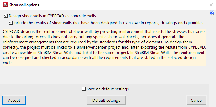 Activando las casillas de este cuadro de diálogo es posible "Dimensionar los muros de cortante dentro de CYPECAD como muros de hormigón" y, en su caso, "Incluir los resultados de los muros de cortante calculados en CYPECAD en listados, planos y mediciones".
