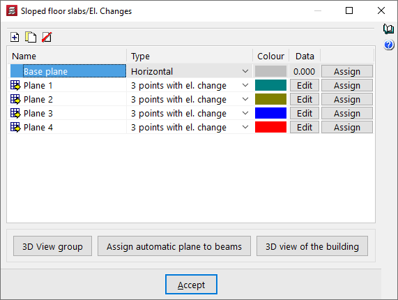 Al pulsar sobre esta opción, se abre la ventana "Forjados inclinados/Desniveles". En esta ventana se muestra una lista con los diferentes planos inclinados o planos horizontales con desnivel definidos, que se encuentran disponibles para asignarlos a paños de forjados específicos en planta.
