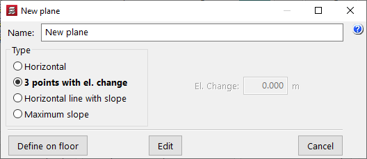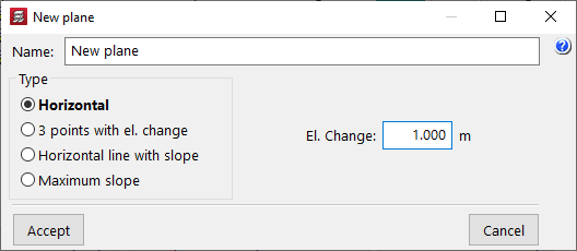 Permite editar los datos necesarios para definir el plano:- En planos de tipo "Horizontal", se indica la distancia del plano definido con respecto al plano base. Esta distancia puede ser negativa (el plano está por debajo del plano base) o positiva (el plano está por encima del plano base).