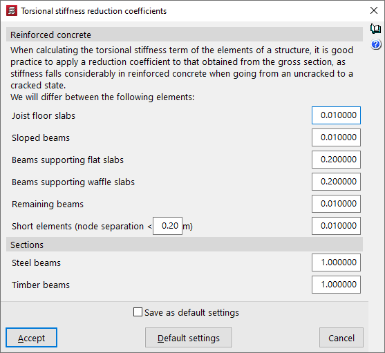 Esta opción permite abrir un cuadro de diálogo donde se pueden definir coeficientes de reducción de la rigidez a torsión de los elementos de la estructura.