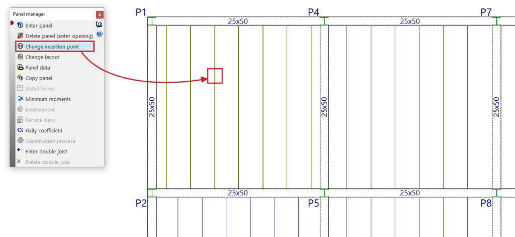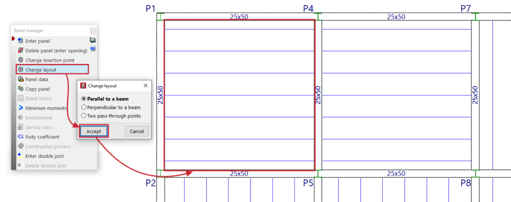 Tras aceptar el panel, se pulsa sobre el paño en planta. Si es necesario, se define después la dirección del armado, ya sea haciendo clic en una viga o seleccionando dos puntos, en función de la opción previamente elegida.