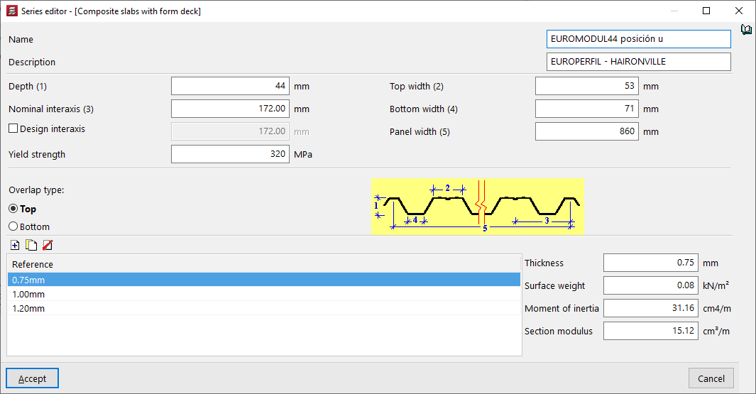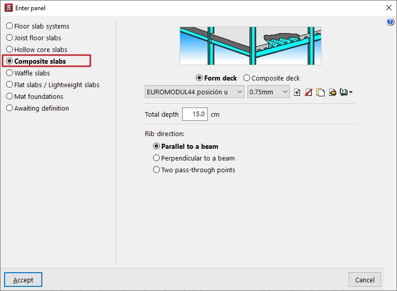 En el caso de obras con losas mixtas, en el apartado "Losas mixtas (en fase de construcción)" se puede "Seleccionar un perfil que permita que no se utilicen sopandas en la fase de construcción", cuando la chapa soporta en solitario la carga dispuesta: