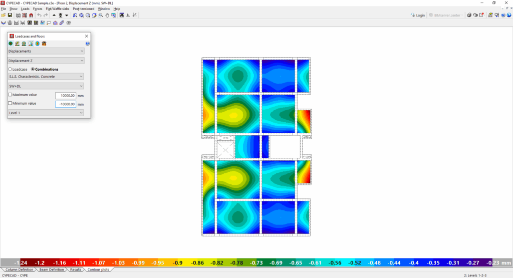 Además, se muestra en pantalla el diagrama de isovalores correspondiente a los desplazamientos elásticos instantáneos en el eje Z de las losas y forjados reticulares del grupo para la combinación seleccionada en los desplegables. Cada color del gráfico representa un valor de desplazamiento diferente.