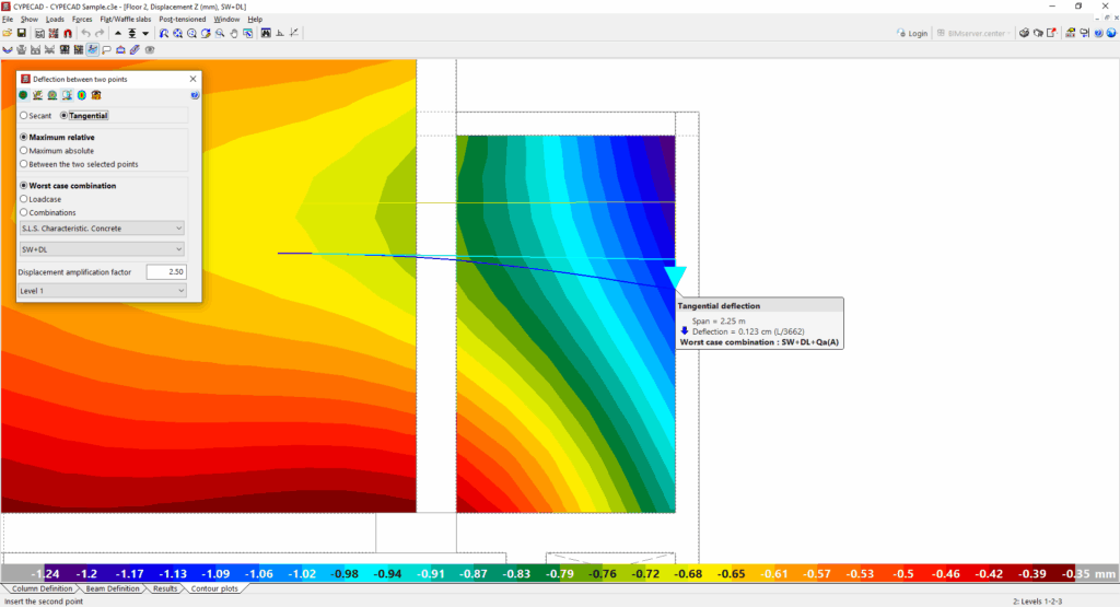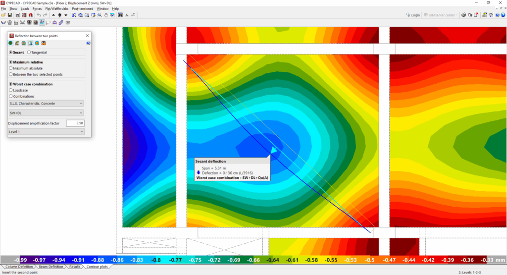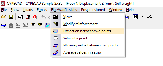 - Conforme a ello, se marcan dos puntos en planta pulsando con el botón izquierdo en el primero y moviendo el cursor hasta otro punto para medir la flecha entre ellos. De esta forma, se previsualizará la información de la flecha. Si se hace clic izquierdo en el segundo punto, la información quedará fija en pantalla. Es posible marcar puntos fuera de la geometría del paño de losa o forjado reticular: