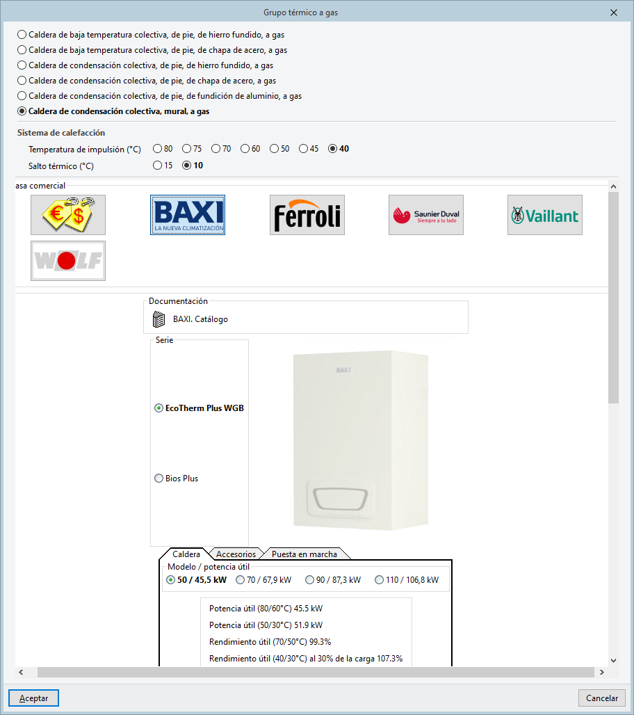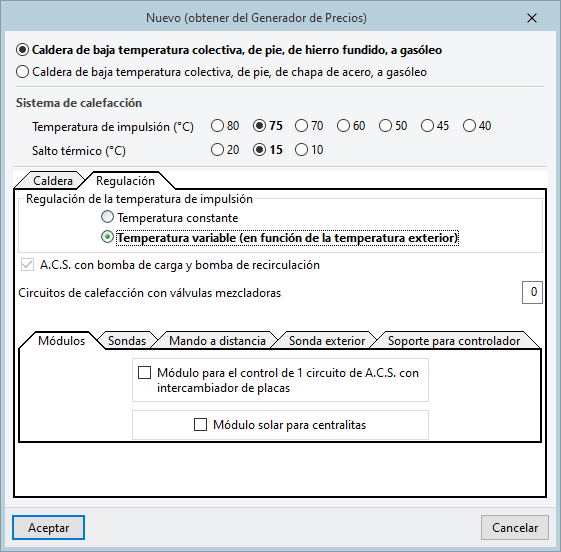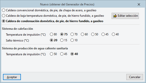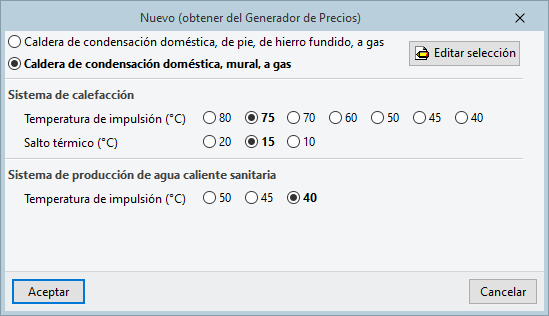- En el panel de edición de los equipos del Generador de precios será necesario indicar, para el "Sistema de calefacción", la "Temperatura de impulsión" y el "Salto térmico" del circuito hidráulico y, si dispone de un "Sistema de producción de agua caliente sanitaria", de la "Temperatura de impulsión" de la misma.