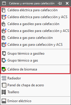 Dentro de la solapa "Climatización", en la barra de herramientas principal de la pestaña "Instalación" de la parte superior se puede encontrar el menú "Calderas y emisores para calefacción", con opciones para introducir los siguientes tipos de calderas y/o grupos térmicos: