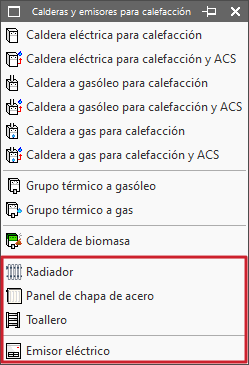 Dentro de la solapa "Climatización", en la barra de herramientas principal de la pestaña "Instalación" de la parte superior se puede encontrar el menú "Calderas y emisores para calefacción", con opciones para introducir los siguientes tipos de emisores para calefacción:
