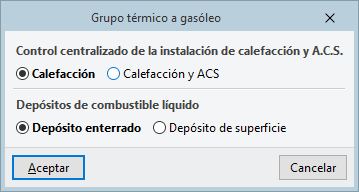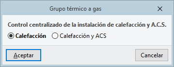 Al pulsar sobre la opción, aparece una ventana emergente donde es necesario indicar, en el apartado "Control centralizado de la instalación de calefacción y A.C.S.", si dicho control es para "Calefacción" únicamente o para "Calefacción y ACS".