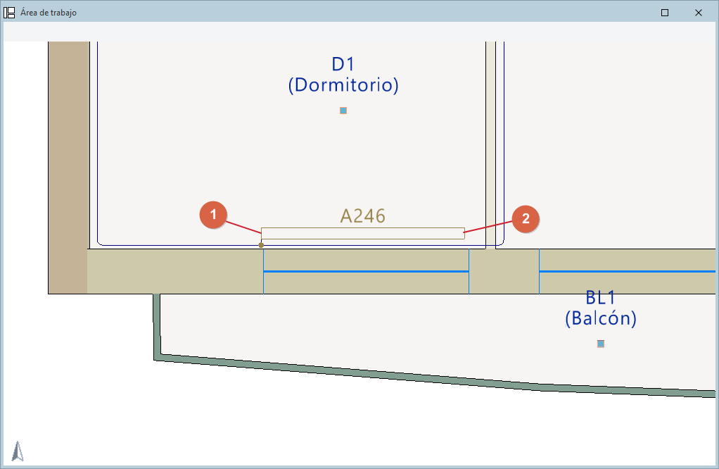 Al disponer en planta un radiador, un panel de chapa de acero o un emisor eléctrico se debe pulsar en dos puntos (1, 2), que marcan el ancho máximo disponible para el emisor. En el proceso de dimensionamiento, el programa tratará de ubicar el emisor (con la configuración necesaria para cubrir las cargas térmicas) en este ancho.