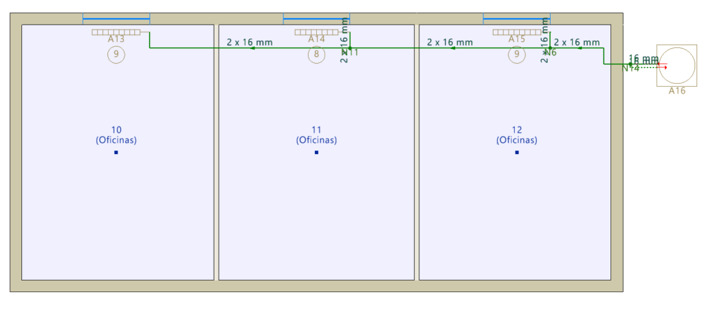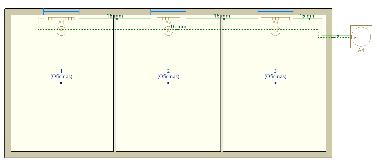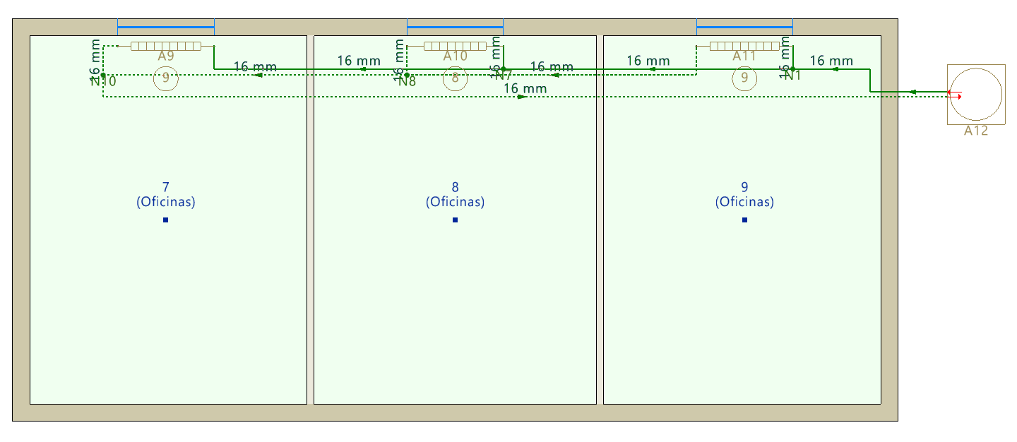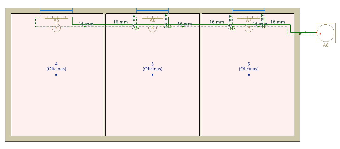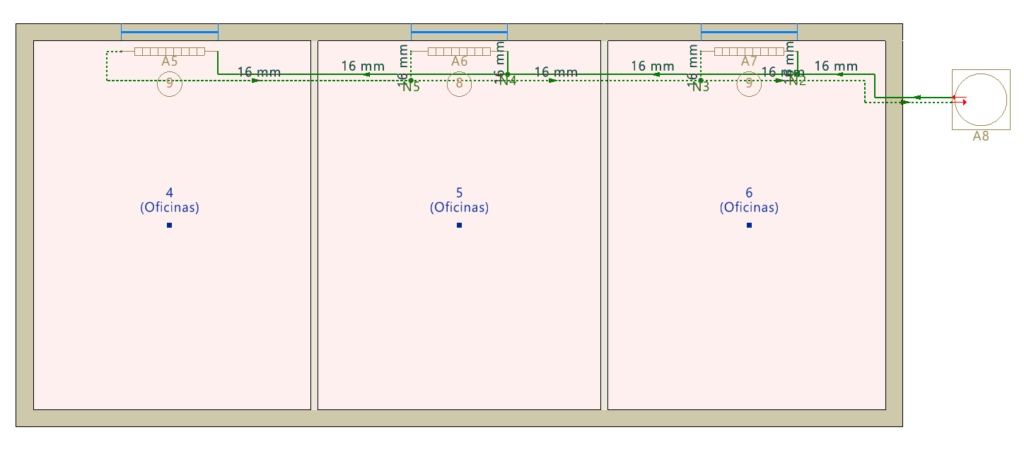Alternativamente y de forma simplificada, es posible conectar la toma de impulsión y de retornode agua del equipo de producción de agua caliente en un punto cercano en planta. A partir de este punto, es posible dibujar una única línea que conecte un solo punto de conexión de cada radiador, dejando el otro sin conectar. Durante el cálculo, el programa identificará automáticamente que en esta línea se deben disponer dos tuberías en el proyecto, dando como resultado una instalación bitubo con retorno directo.