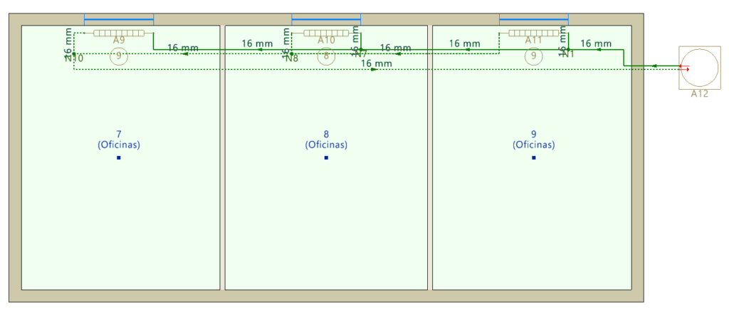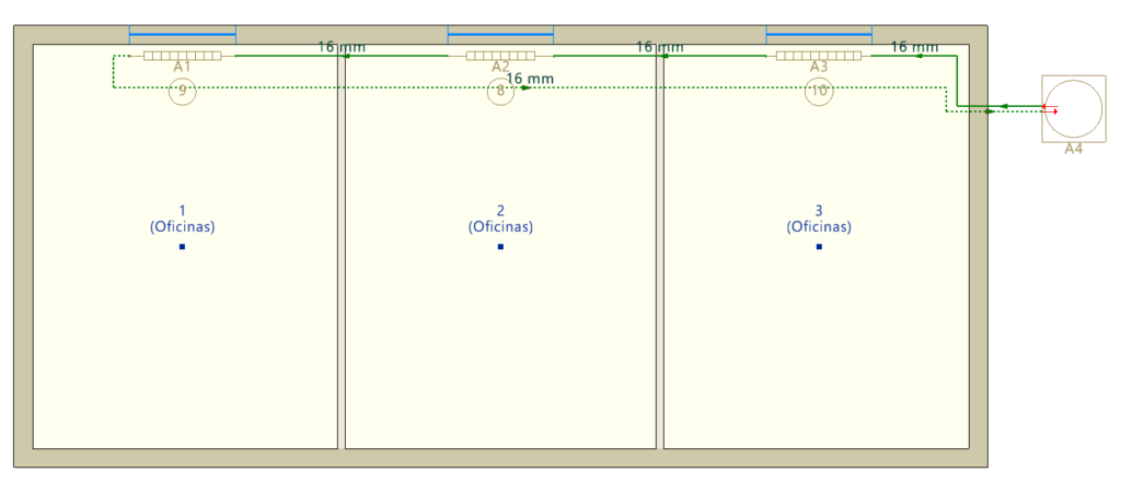 - Se bifurcan cada una de las tuberías creadas en los pasos anteriores, conectando en cada bifurcación las dos tomas de cada uno del resto de los radiadores.