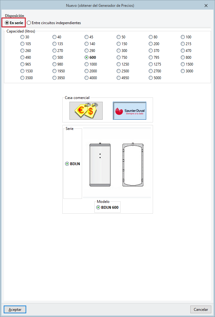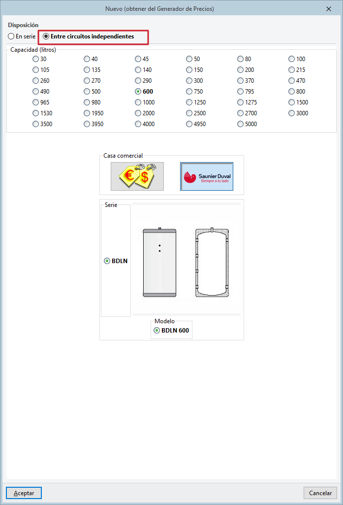 Esta opción permite incluir depósitos de inercia en las instalaciones de calefacción y climatización por agua. El programa permite dos tipos de disposición en la instalación para los depósitos de inercia: