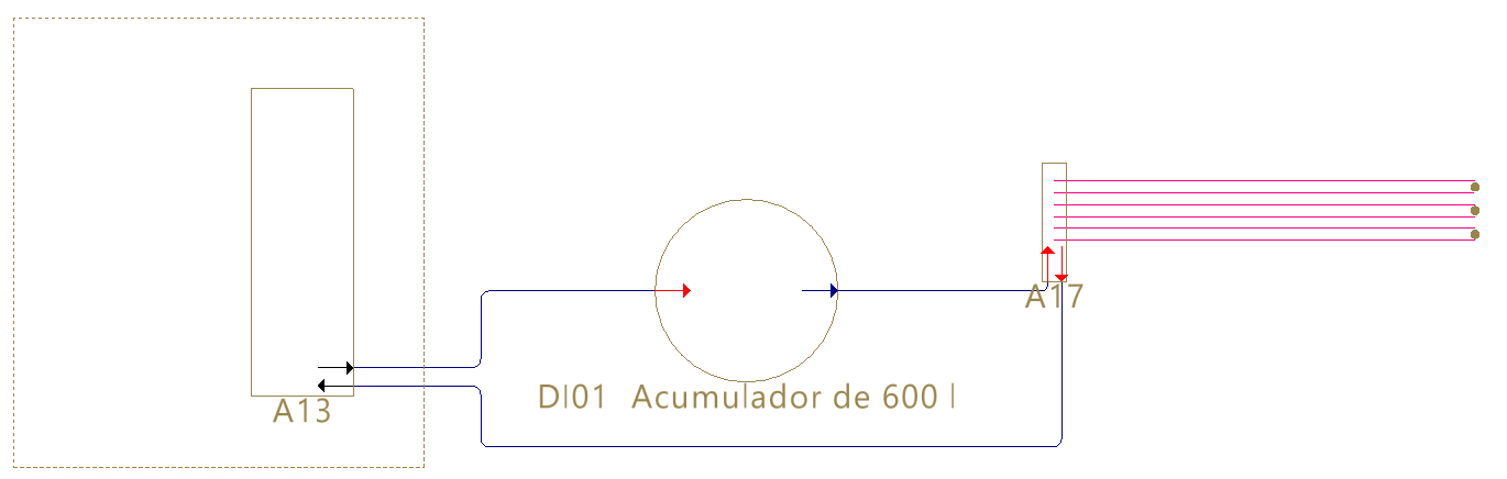 - en la solapa "Climatización", presenta dos puntos de conexión de tuberías de agua de impulsión y de retorno que pueden conectarse con las tomas de "Impulsión del sistema de ACS" y "Retorno del sistema de ACS" de un "Intercambiador de placas de ACS auxiliar" introducido en esta misma solapa;
