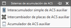 Dentro de la solapa "Climatización", en la barra de herramientas principal de la pestaña "Instalación" de la parte superior se puede encontrar el menú "Sistemas de acumulación de ACS", con opciones para introducir los siguientes equipos de acumulación de agua caliente sanitaria o de intercambio térmico para la producción de agua caliente sanitaria: