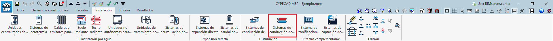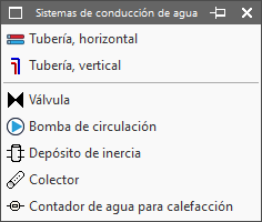 Dentro de la solapa "Climatización", en la barra de herramientas principal de la pestaña "Instalación" de la parte superior se puede encontrar el menú "Sistemas de conducción de agua", con opciones para introducir los componentes de las redes de distribución de agua: