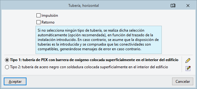 En el panel de edición es posible forzar la consideración de la línea dibujada, indicando si representa una tubería de "Impulsión", de "Retorno" o ambas, activando las casillas correspondientes. Esto no es necesario en la mayor parte de casos, puesto que el programa interpreta esta información a partir del trazado de tuberías realizado en el modelo y los equipos y tomas que conectan.