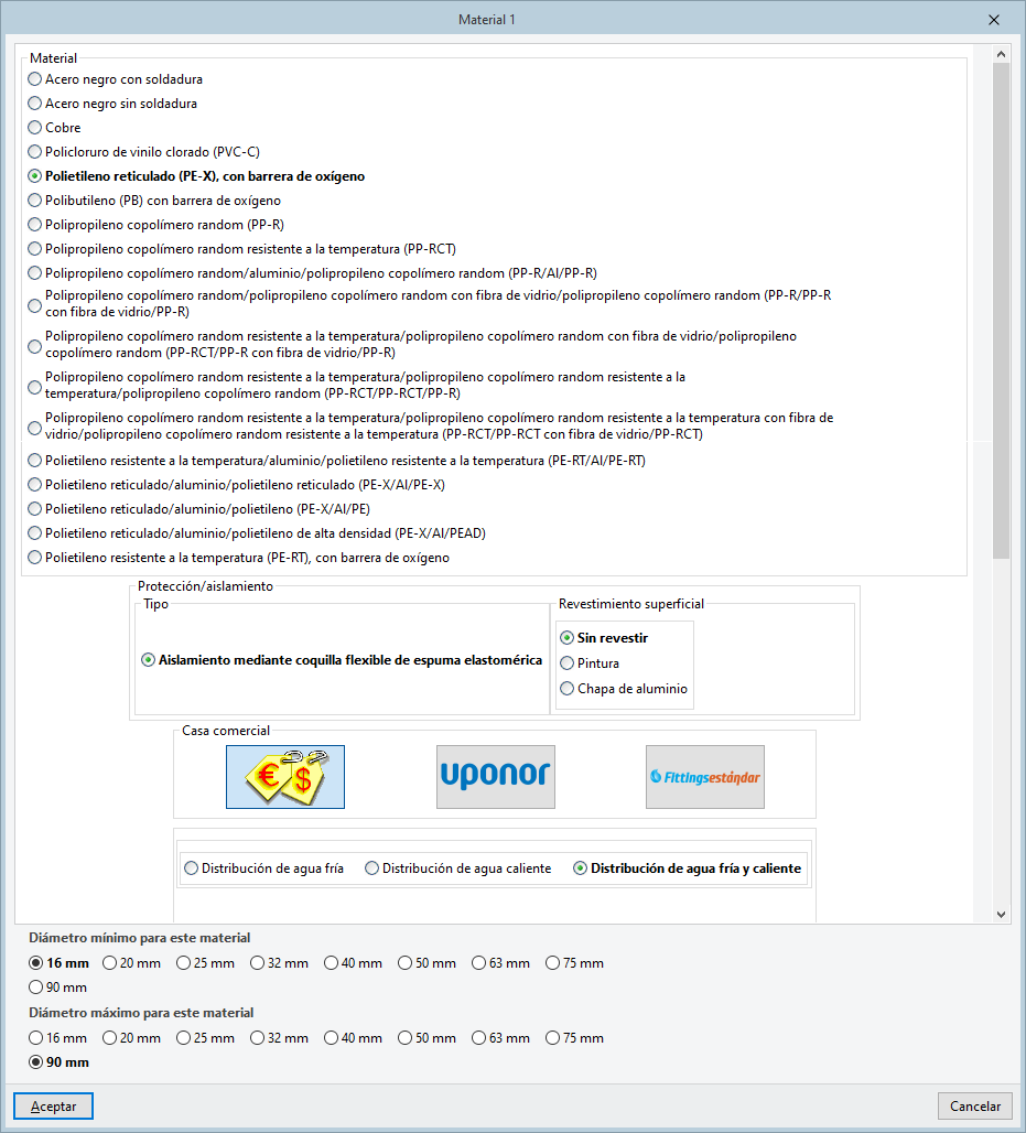 Por último, se puede forzar el "Diámetro mínimo para este material" y el "Diámetro máximo para este material" para acotar el rango de diámetros disponible en el proceso de dimensionamiento de las tuberías que el programa ejecuta durante el cálculo.