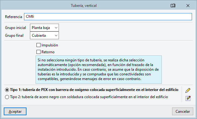 Para disponer este elemento es necesario indicar la "Referencia" de la tubería, su "Grupo inicial" y "Grupo final". De esta forma, la tubería vertical aparece como un punto en cada uno de los grupos de plantas que atraviesa. Es posible conectar una "Tubería, horizontal" en estos puntos.