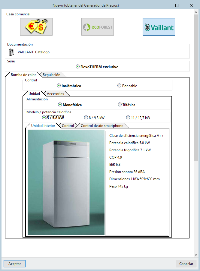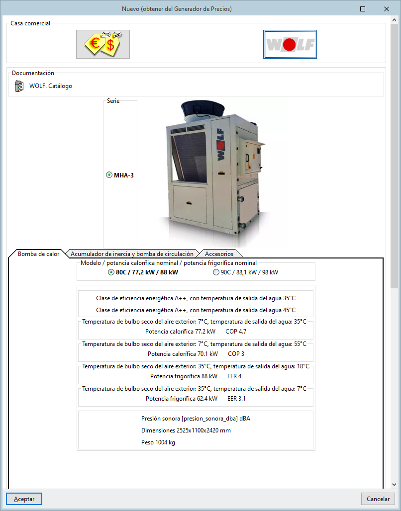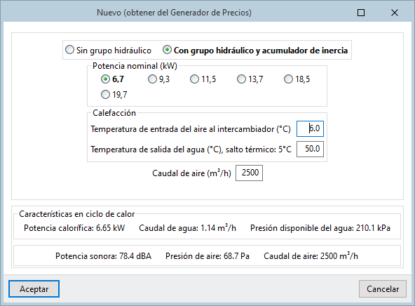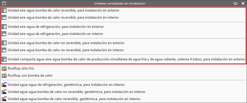 Dentro de la solapa "Climatización", en la barra de herramientas principal de la pestaña "Instalación" de la parte superior se puede encontrar el menú "Unidades centralizadas de climatización", con opciones para introducir los siguientes equipos compactos de producción de agua caliente y/o fría:
