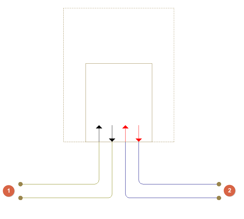 - y dos conexiones para tuberías de agua de impulsión y de retorno del circuito interior (2), que se pueden conectar con elementos interiores de la instalación como colectores de suelo radiante o fancoils utilizando las opciones "Tubería, horizontal" y "Tubería, vertical" del menú "Sistemas de conducción de agua".
