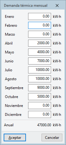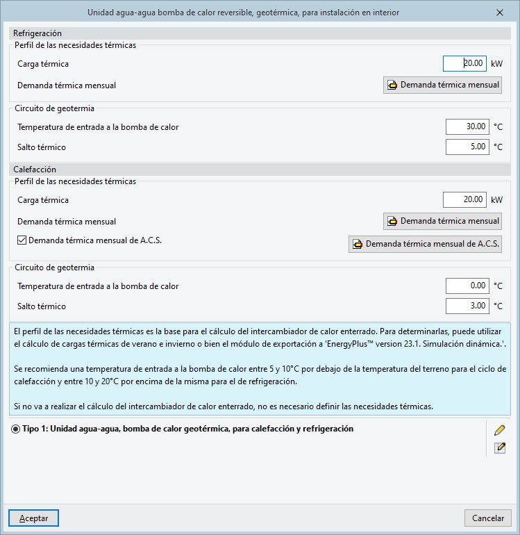 Si se va a realizar el cálculo del intercambiador de calor enterrado en una instalación de energía geotérmica, es necesario definir el perfil de las necesidades térmicas del edificio introduciendo los siguientes datos en el panel de edición de la unidad agua-agua geotérmica (bomba de calor o unidad de refrigeración):