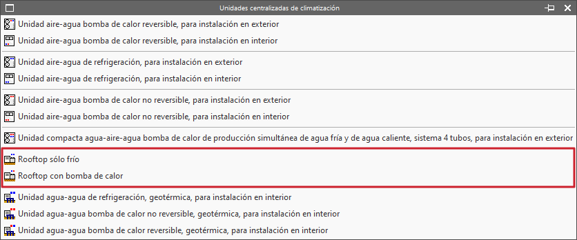 Dentro de la solapa "Climatización", en la barra de herramientas principal de la pestaña "Instalación" de la parte superior se puede encontrar el menú "Unidades centralizadas de climatización", con opciones para introducir los siguientes equipos rooftop: