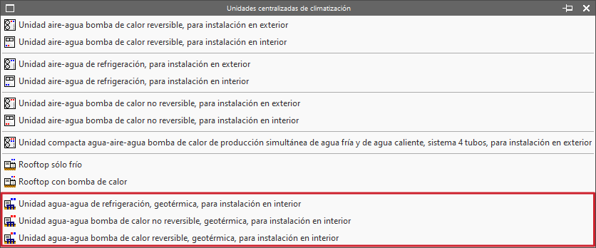 Dentro de la solapa "Climatización", en la barra de herramientas principal de la pestaña "Instalación" de la parte superior se puede encontrar el menú "Unidades centralizadas de climatización", con opciones para introducir los siguientes equipos de producción de agua caliente o fría en las instalaciones geotérmicas:
