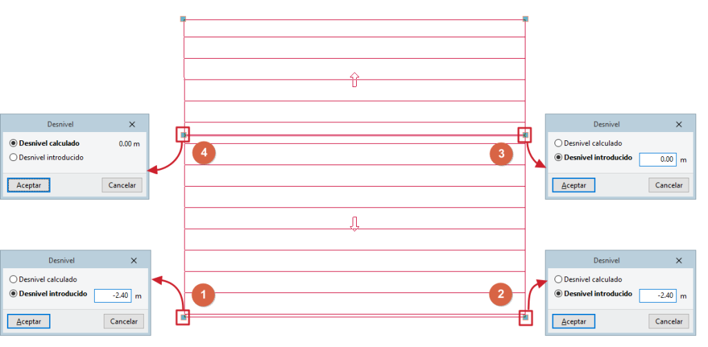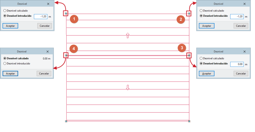 El usuario introduce el desnivel del punto seleccionado respecto a la altura de la planta, ya sea positivo o negativo.