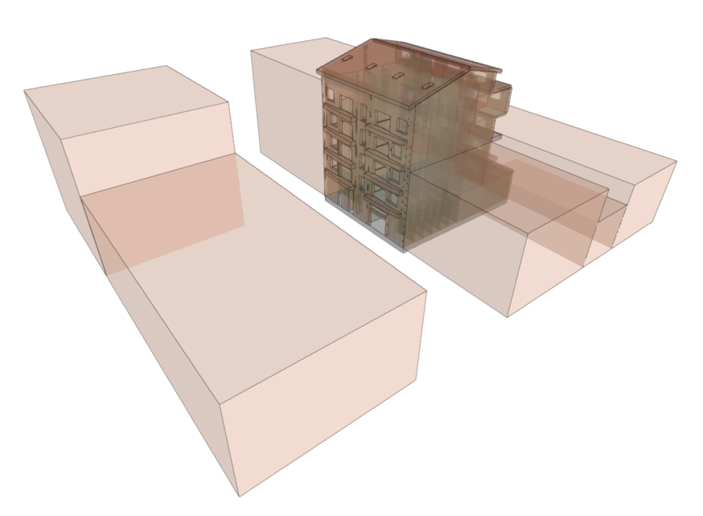 Los elementos de sombra permiten simular el efecto de salientes de fachada como los retranqueos, los voladizos sobre la ventana o las proyecciones laterales que producen sombreamiento sobre el hueco, en caso de que no hayan sido definidos en el modelo geométrico directamente (dibujando elementos como muros y particiones o forjados).