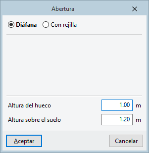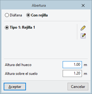 La definición de aberturas pasa por indicar si se trata de una abertura "Diáfana" o si está cubierta por una "Rejilla", en cuyo caso se crea y selecciona una determinada tipología de rejilla: