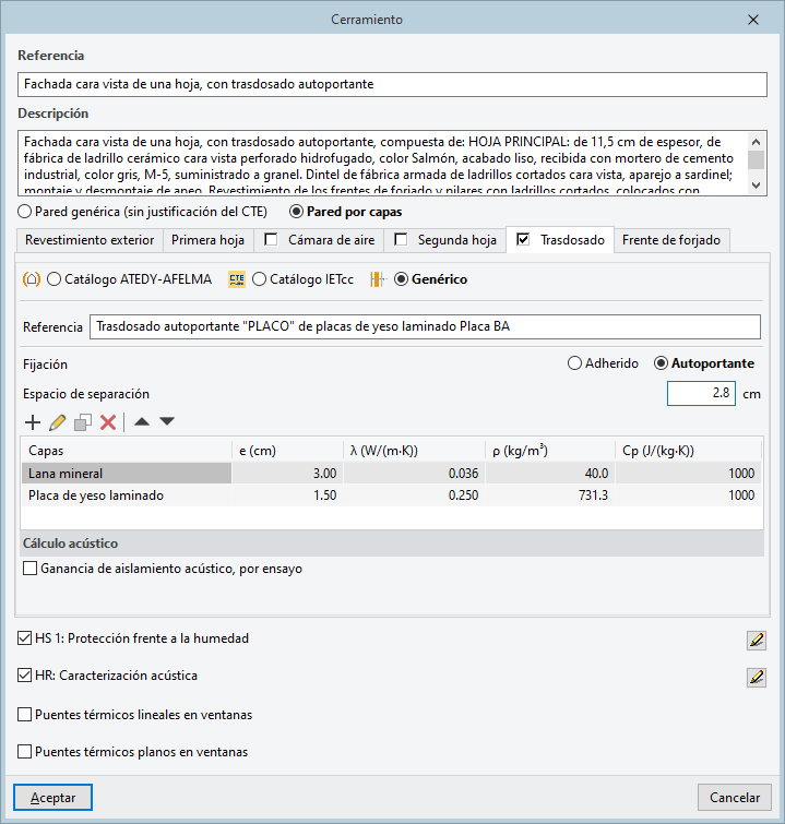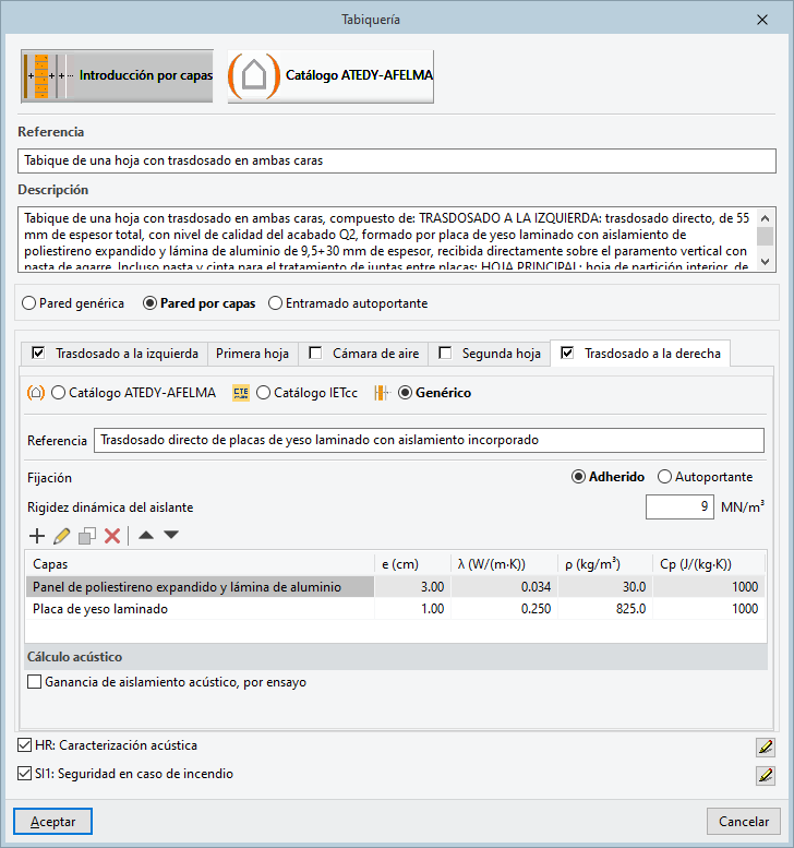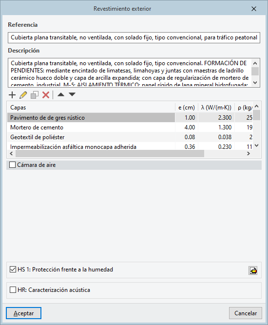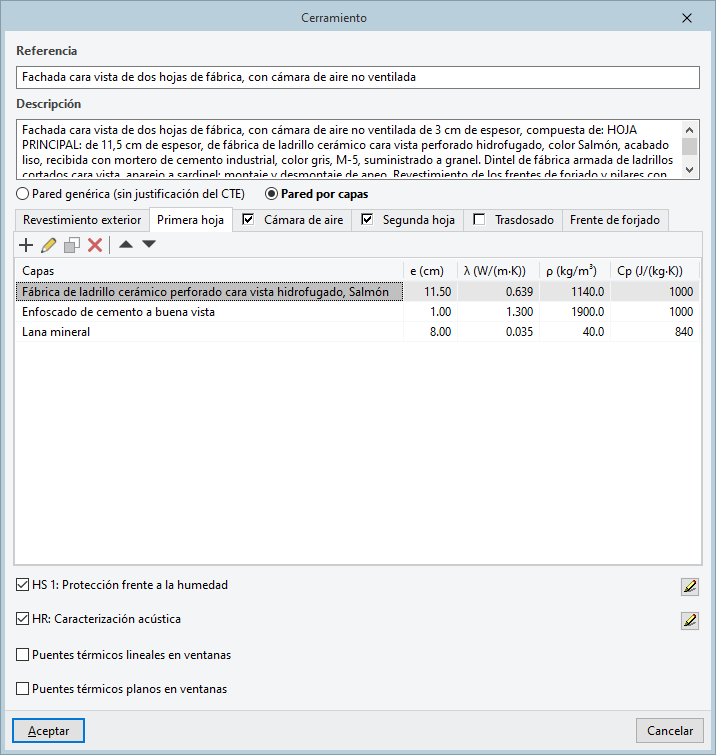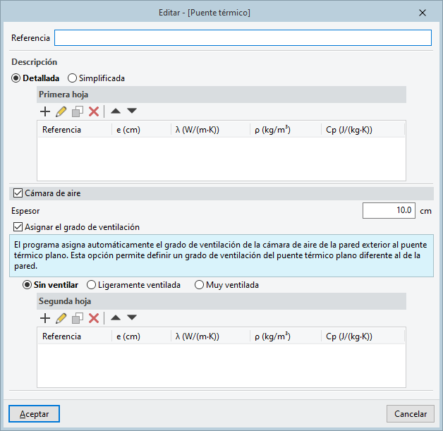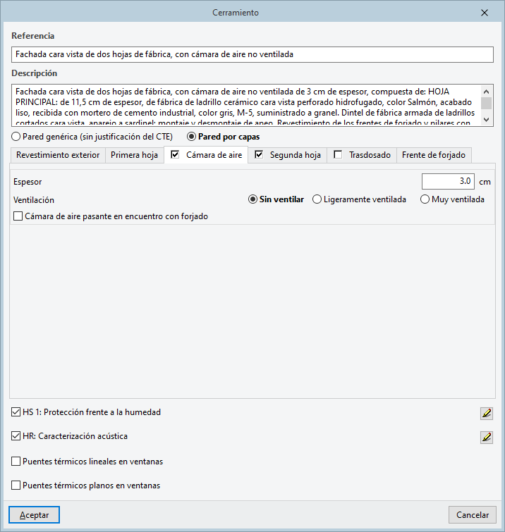 En el caso de utilizar una descripción detallada, es posible indicar la existencia de una "Cámara de aire" y especificar sus parámetros:- Espesor