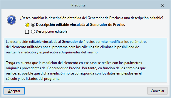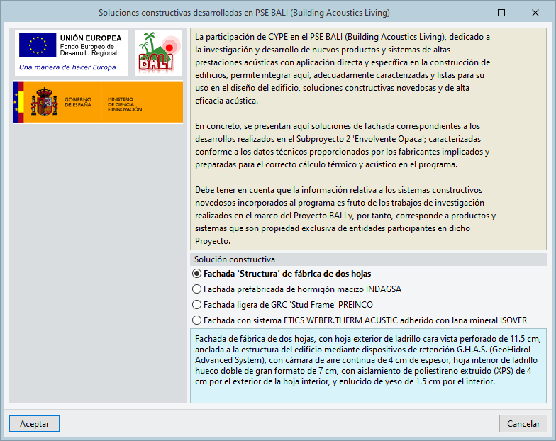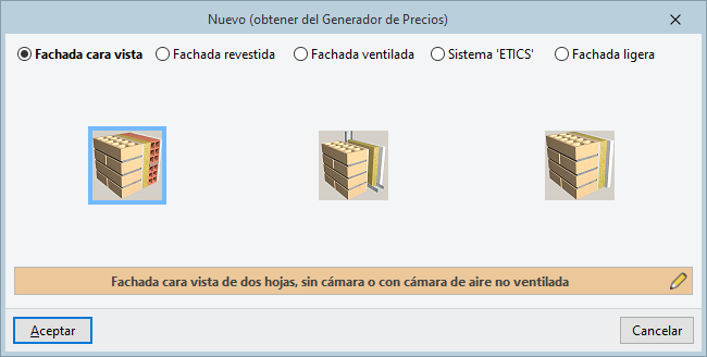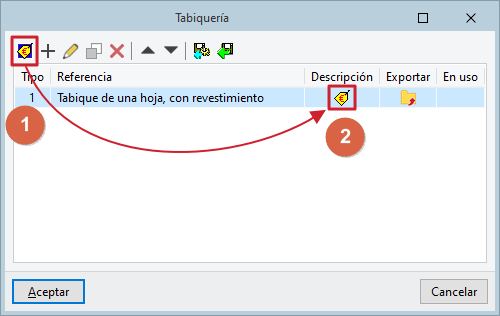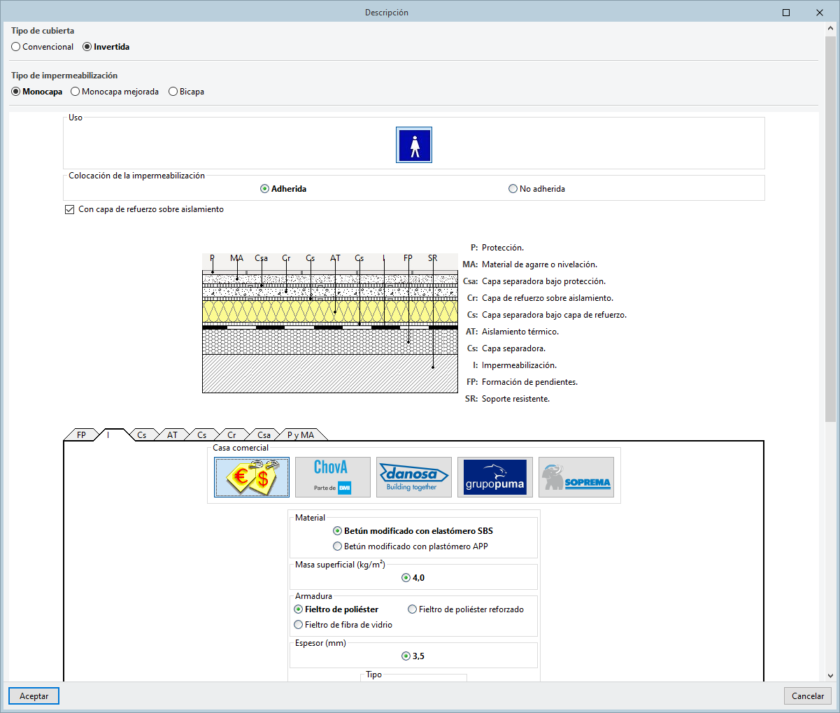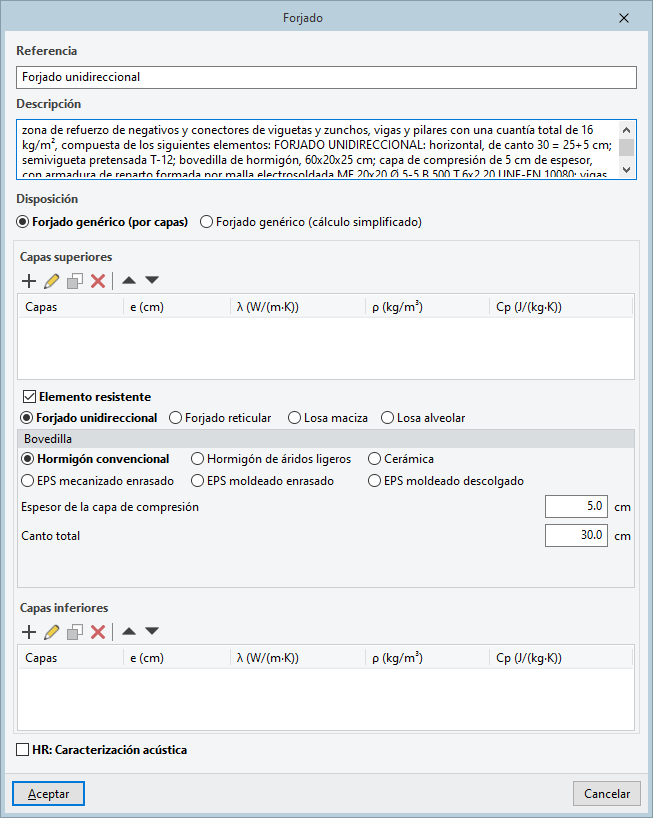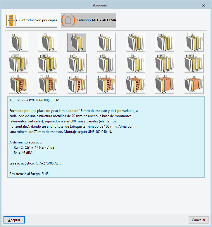 En el caso de utilizar una descripción detallada, es posible indicar la existencia de una "Cámara de aire" y especificar sus parámetros:- Espesor