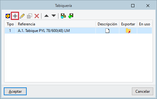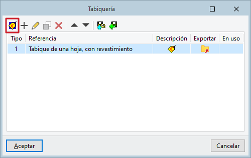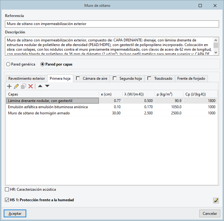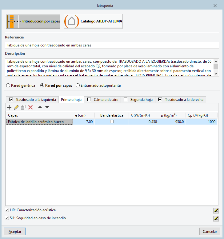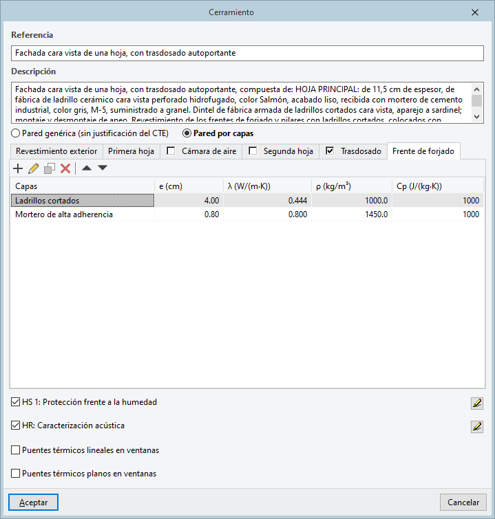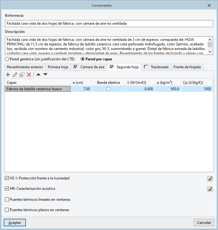 Si se opta por una definición detallada, es necesario introducir las capas que componen el puente térmico plano:- Primera hoja