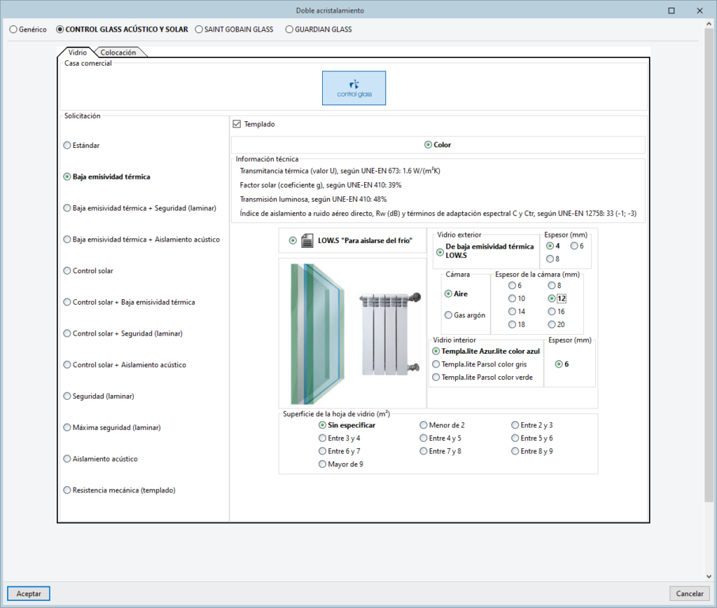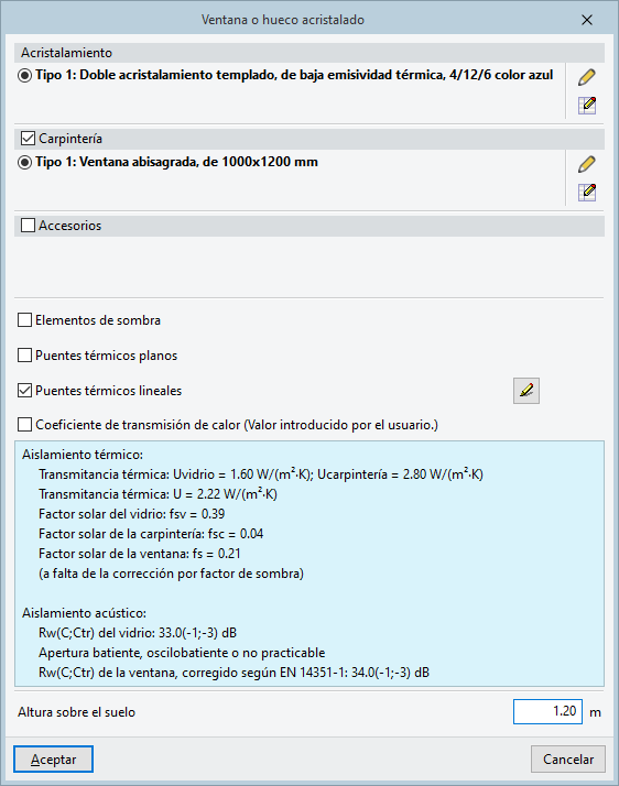 Permite considerar y definir las dimensiones y características del puente térmico lineal en el límite entre el marco y el acristalamiento. La ayuda a la derecha ofrece diferentes valores de "Transmitancia térmica lineal según la norma UNE-EN ISO 10077-1".- Longitud